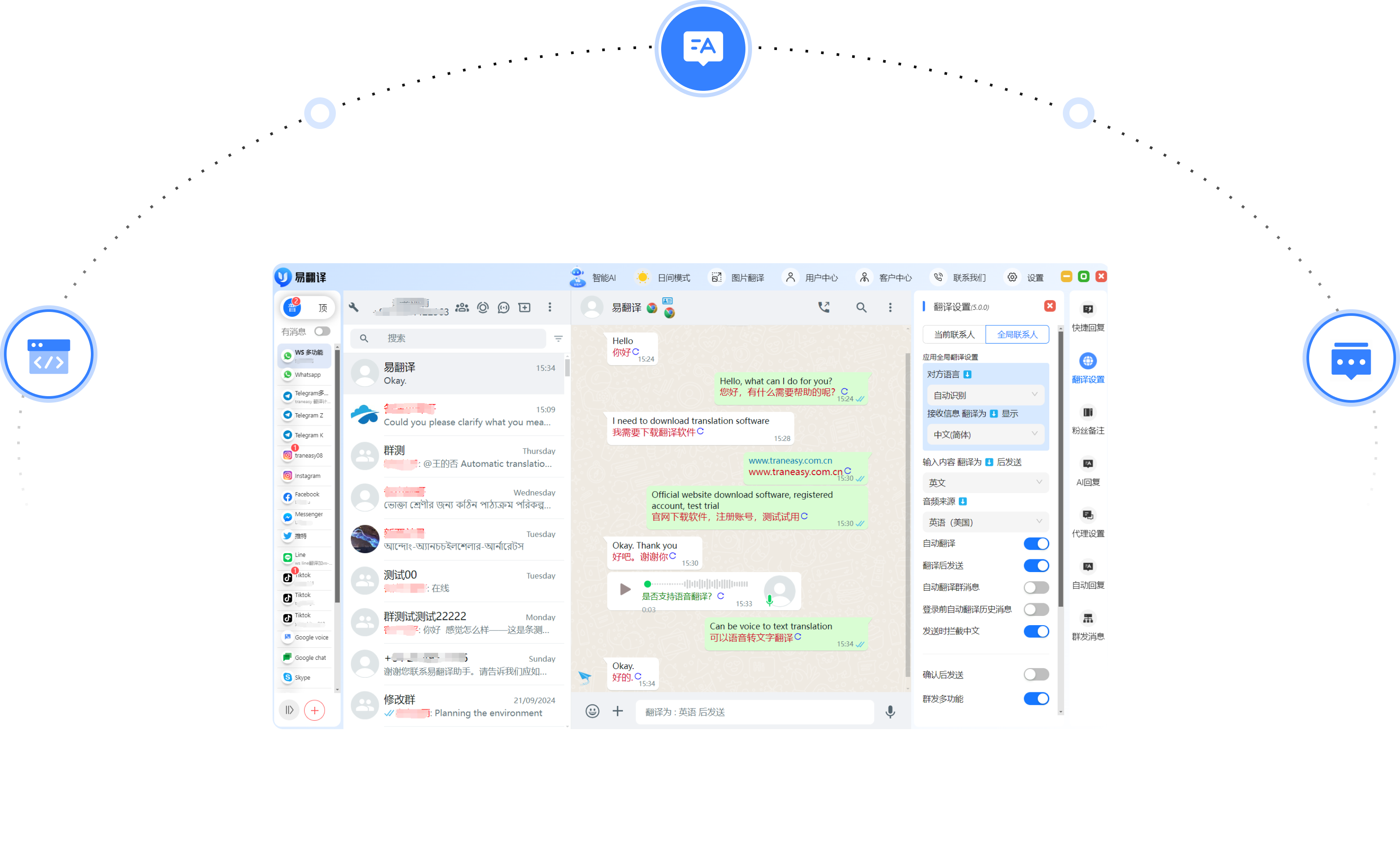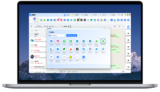 易翻译集成了whatsapp/line/zalo/telegram等全球主流社交软件